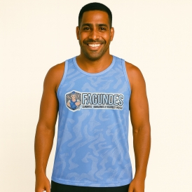 As estampas são feitas com sublimação total sem limite de cores podendo estampar até a regata toda.
